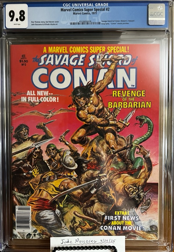 – Marvel Comics Super Special #2 9.8 CGC KEY: “Conan” movie preview: Savage Sword of Conan. Art: Roy Thomas story: Get him to sign at CGC!! $500